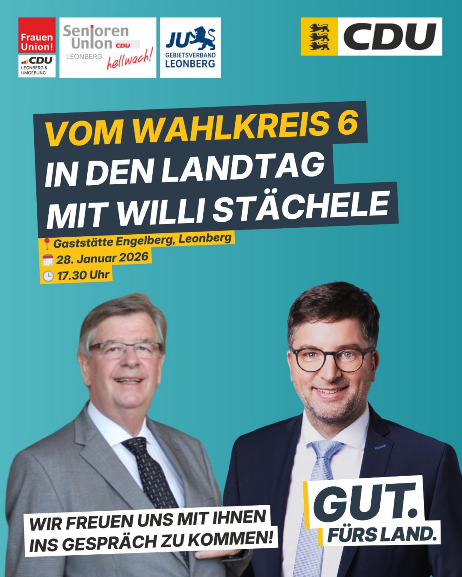 Die Senioren-Union Leonberg, die Junge Union Gebietsverband Leonberg und die Frauen-Union Leonberg laden im Rahmen des Wahlkampfes für die Landtagswahl am 8. März 2026 zu einer öffentlichen Veranstaltung mit Herrn Willi Stächele MdL, Minister a.D. und unserem Landtagskandidaten Herrn Albrecht Stickel nach Leonberg ein.